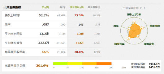 中央では2戦、その後の金沢では5戦しましたが未勝利に終わりました。金沢での5戦未勝利ではファンド解散は致し方なしです。個人的に残念だったのは金沢での出走です。定期的に勝利をおさめないと、賞金的にファンドが継続できないというのが厩舎として理解できていない様な使い方でした。厩舎の2頭だしとかあってどちらかが勝てれば。。。と言うような使い方もありました。ファンド解散ギリギリという緊張感が無いままファンド解散になった感じがします。飼葉量を稼がないと早期にファンド解散になるということがクラブ側から陣営にしっかりと伝わっていたのかも疑問です。おそらく陣営としては、「そろそろ勝てそうだな」と思っていたところでファンド解散だったのではないでしょうか。なんかしっくりしなかったです。まぁ、このクラブでは地方移籍まで考慮して出資しないといけないので、今後はダート適性がより高い馬に出資しなくてはならないことが解りました。